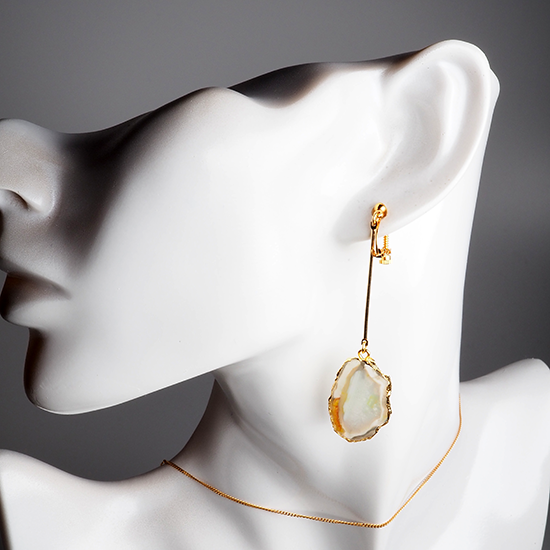 この石にはメノウ特有の何層にも重なった縞模様がなく、抽象的なやさしい模様が特徴です。ベースは氷のような透明感にイエローとホワイトのペインティングアートのような模様が個性的で、自然が生み出した面白さが楽しめる石のデザインです。長さのあるデザインは耳につけたときに、石の美しい模様が一層ひきたちます。また、側面をコーティングしたゴールドが石の美しさを更に引き立たせ、丁寧な作りで肌を飾ってくれます。