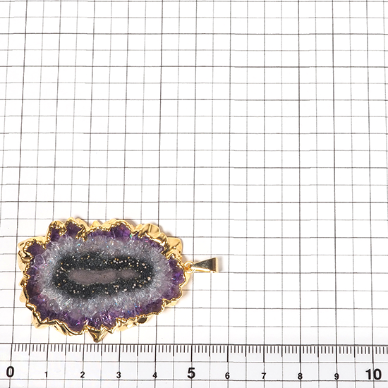 こちらのフラワーアメジストはアゲート質の芯を中心に、長い年月をかけて鍾乳石状に結晶してできたアメジストの原石をスライスして研磨したものです。アゲート質でできた中心部分のシックなブラックカラーの濃淡と、花のように広がるパープルカラーのアメジストの結晶がとても繊細で美しい模様です。
