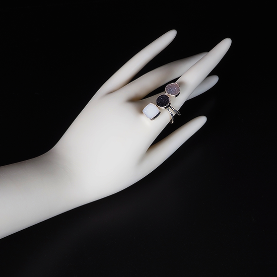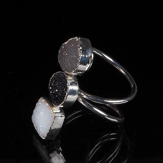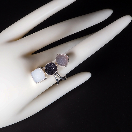 【一点物】遊び心のあるデザインと3色のモノトーンカラーの結晶ドゥルージーがモードな雰囲気のアクセサリー、ユニークなデザインリング